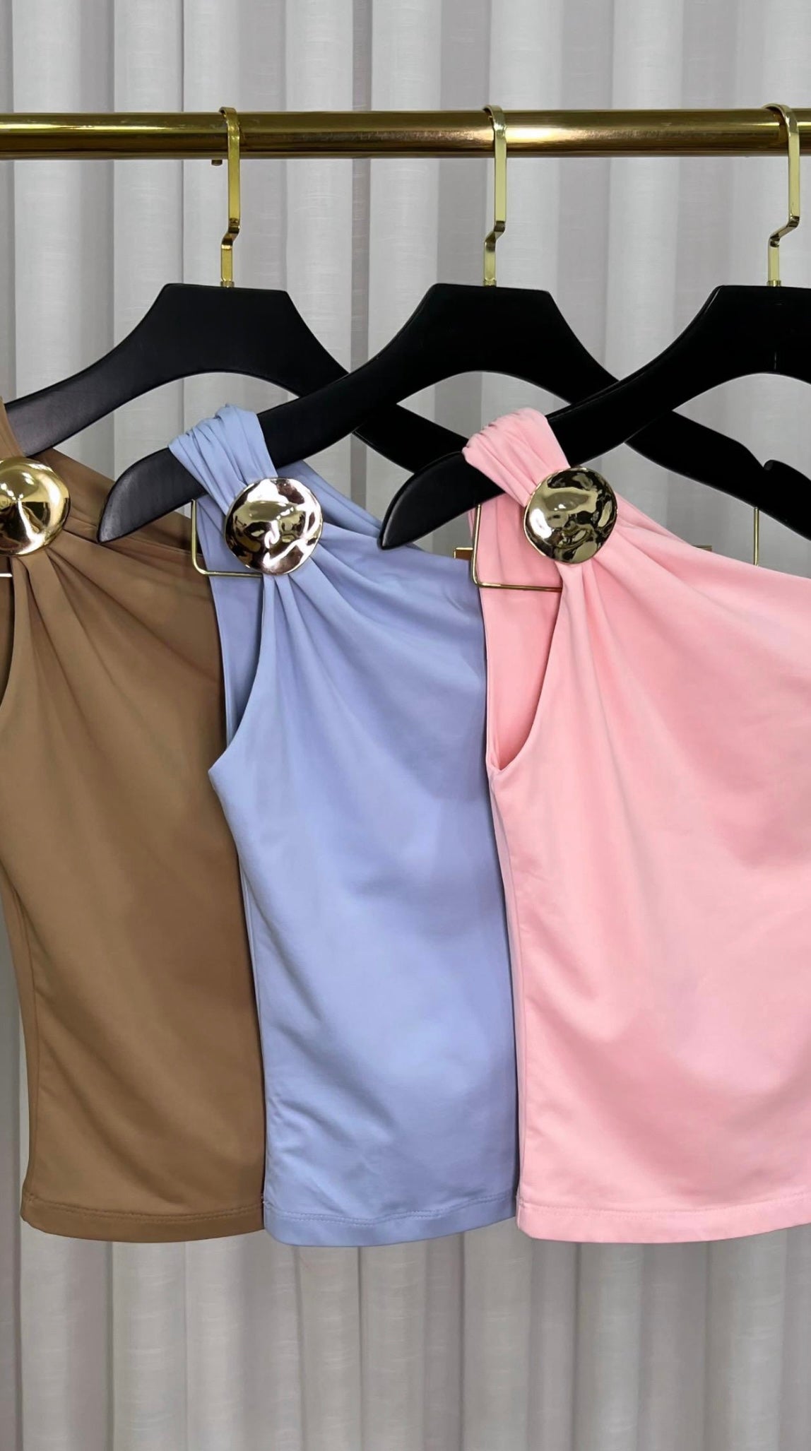 In a delicate light pink hue, the design features a one-shoulder silhouette with a round gold accent on the strap — a subtle statement that elevates the minimalist shape. Its polished construction and soft stretch make it a versatile essential for refined, everyday looks.